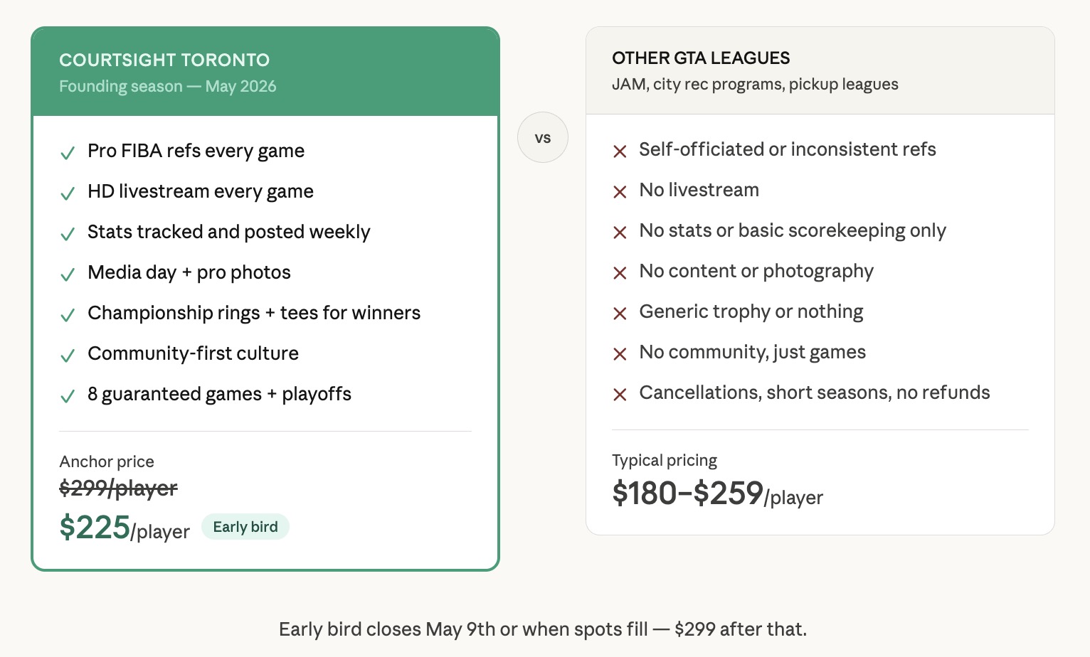 Courtsight Toronto launches May 23rd. Ontario's fastest growing basketball league. Pro-style stats, Referees, media coverage, and a competitive community built for hoopers.